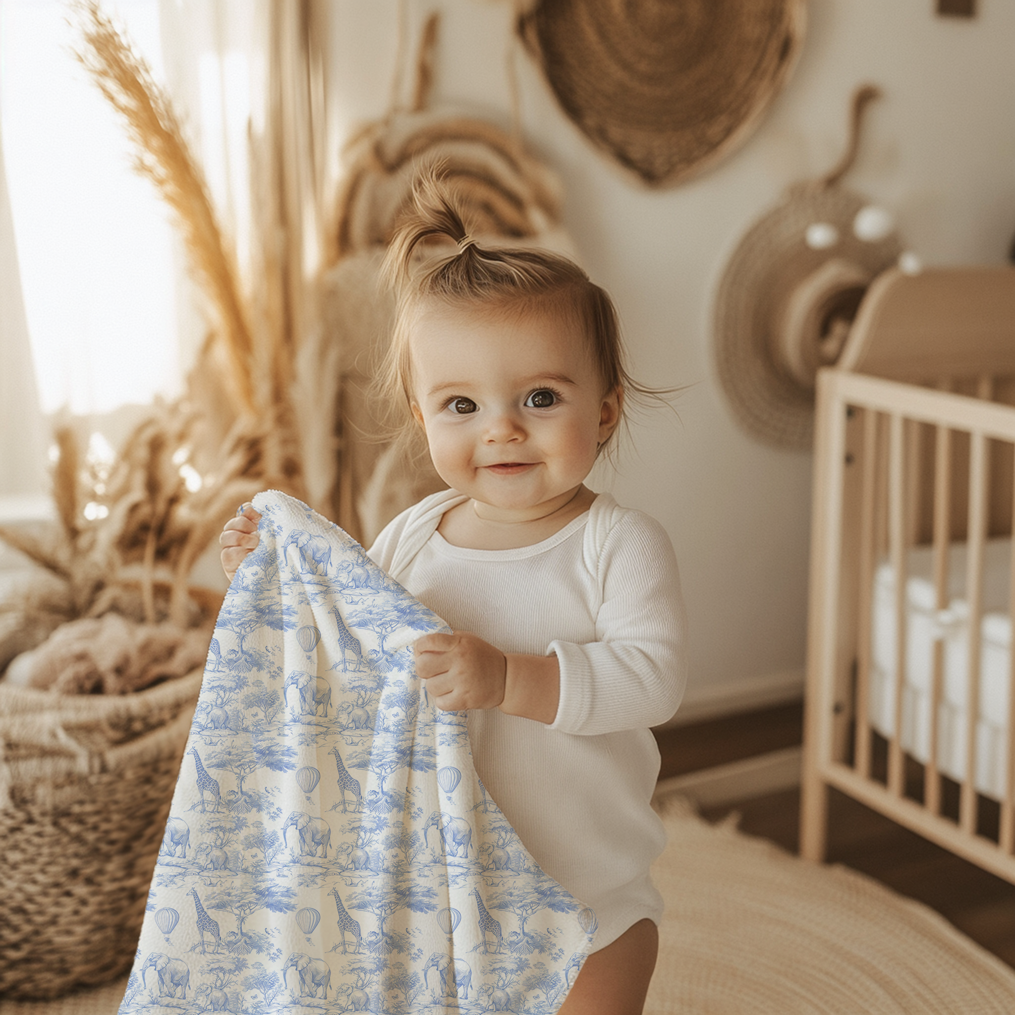 It’s more than just a blanket; it’s a beautiful heirloom piece that brings the adventure and calm of the African safari right into your home. The charming blue and white motif makes it a stunning addition to any nursery decor and a truly unforgettable baby shower gift.