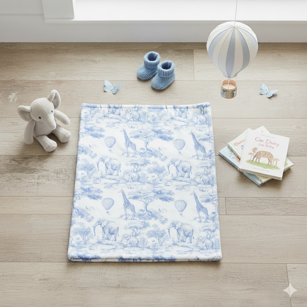 Wrap your little one in the peaceful charm of the savanna with our Safari Serenity Fleece Blanket. This generously sized 1.5 x 1 meter blanket features a whimsical, hand-drawn Toile de Jouy-inspired pattern in calming shades of blue and white.